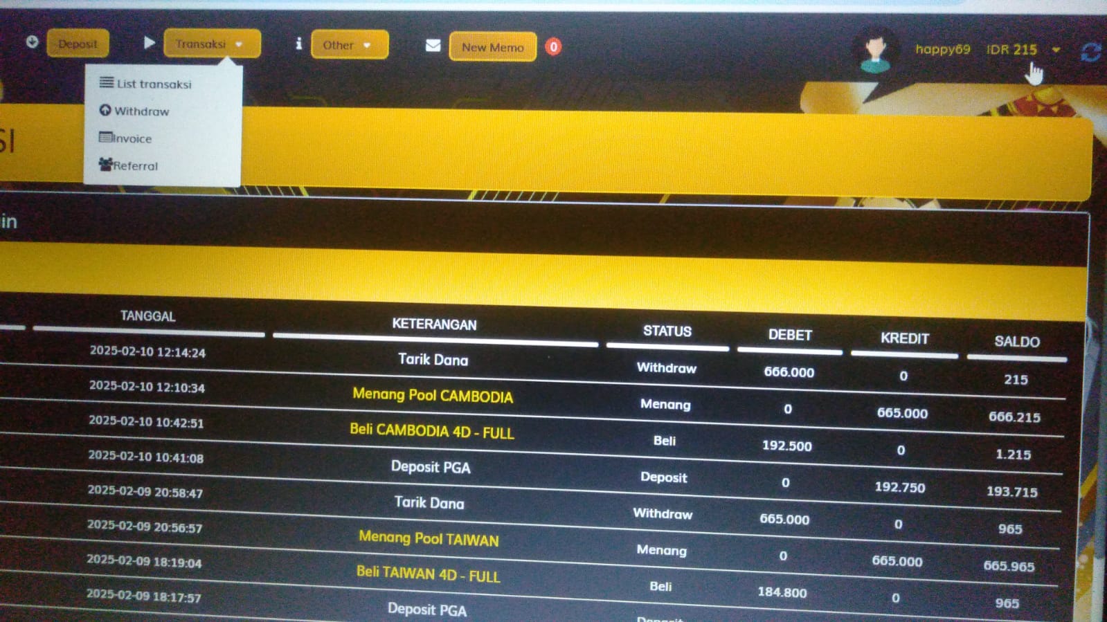 B. Bukti screenshot Transaksi Betting