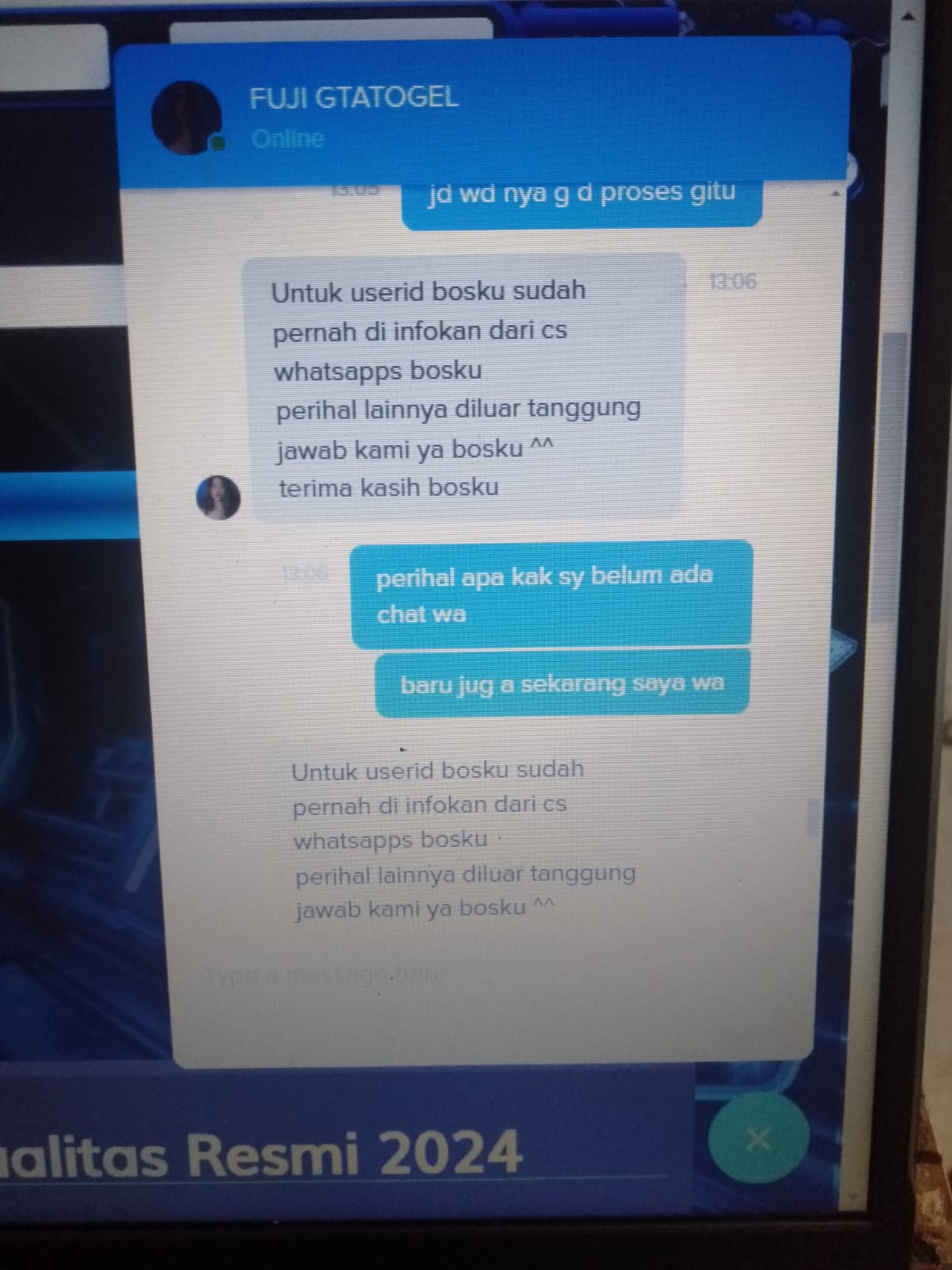Saya mengajukan pertanyaan ke CS, disuruh menunggu sampai jam 12 siang esok hari (9 Juni 2022). Tanggal 09 Juni 2022 Pukul 17.00 WIB, saya coba bertanya ke CS, disuruh menunggu hingga jam 8 malam. Saya mengajukan pertanyaan apa kesalahan dari akun saya sehingga tidak bisa login? CS menjawab bahwa akun saya telah terdeteksi melakukan betting secara ilegal dan melebihi batas line dari sistem.