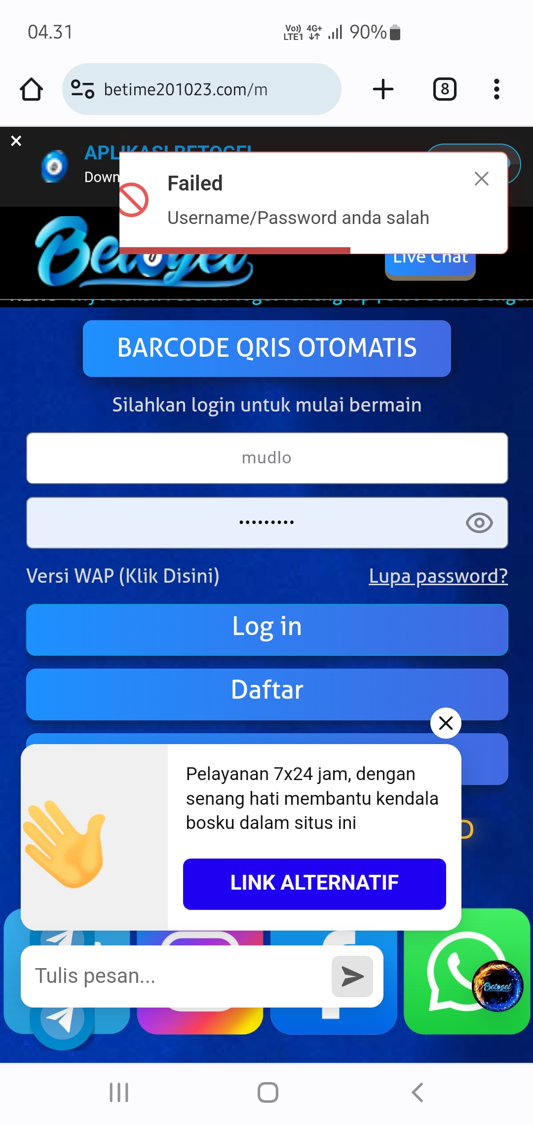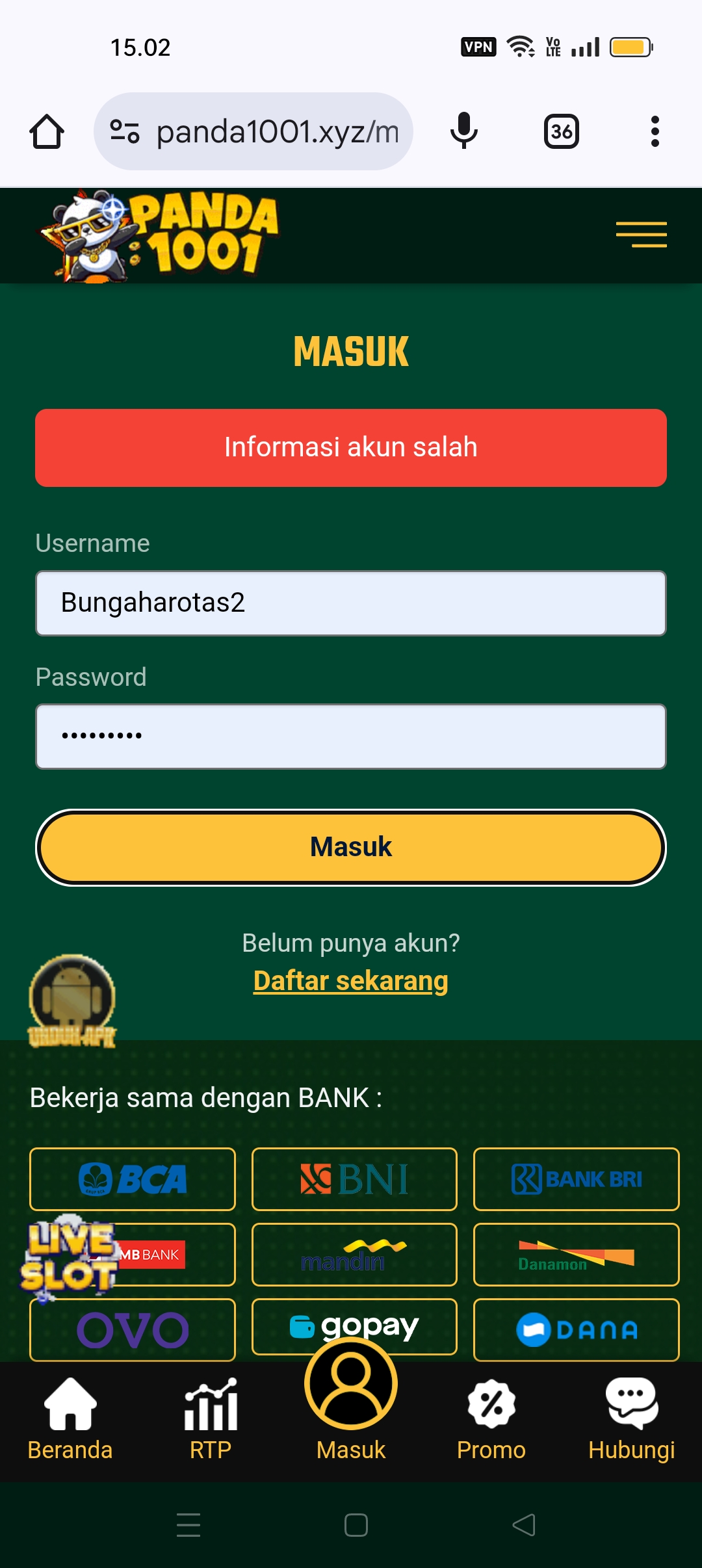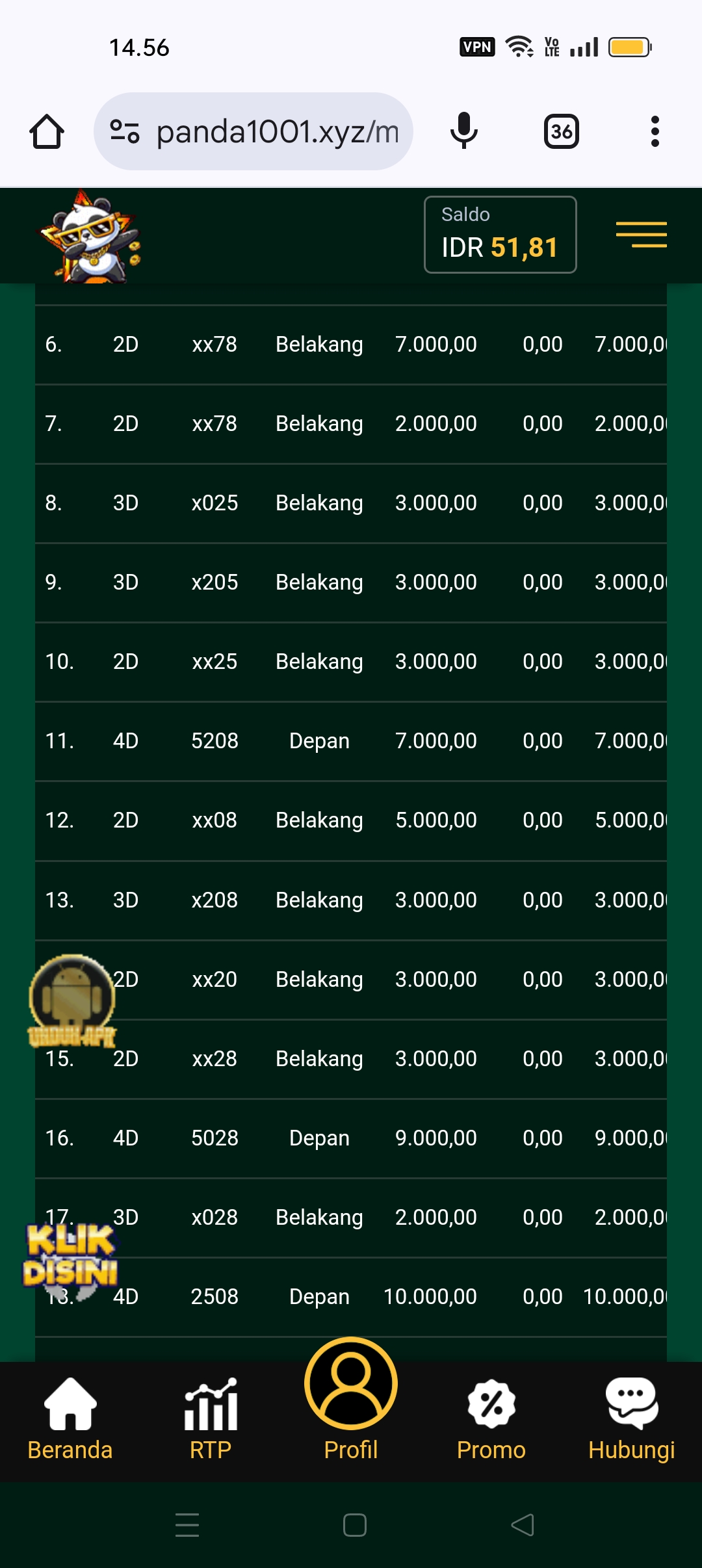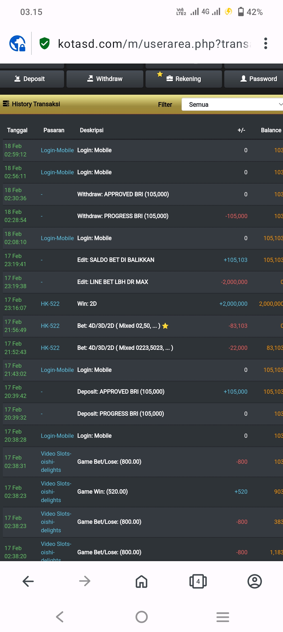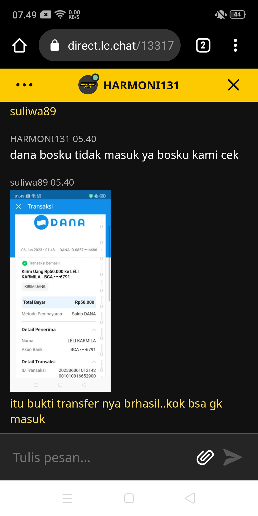 Setiap malam saya betting hk di lotus4d.com via pc dengan mengakses ip address lotus4d (https://94.237.75.120:88/wap). Kemarin malam (Rabu 08 Juni 2022) saya betting jam 22.00. Setelah saya membuat format betting untuk wap, saya inputkan ke kolom taruhan. Tapi karena nilai jumlah betting saya lebih besar dari sisa saldo, proses betting batal saya lanjutkan. Saya melakukan deposit sebesar 1.000.359 ke rekening admin a/n Mei Wulandari dahulu. Setelah melakukan deposit, beberapa saat kemudian saya refresh halaman website malah mendapatkan “Account anda tidak valid”.